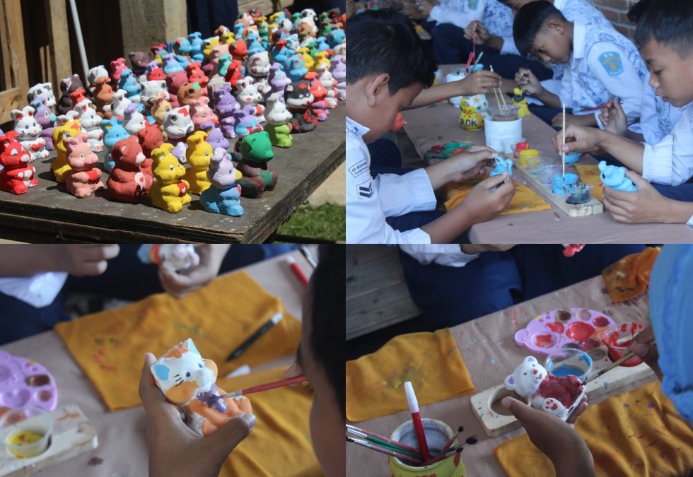 Melukis Tempat Pensil, tempat pensil ini terbuat dari gerabah dengan berbagai macam bentuk hewan. Ketika akan dilukis tempat pensil ini sudah diberikan warna dasar yaitu putih untuk memudahkan proses melukis. Estimasi waktu yang dibutuhkan 20- 30 menit.