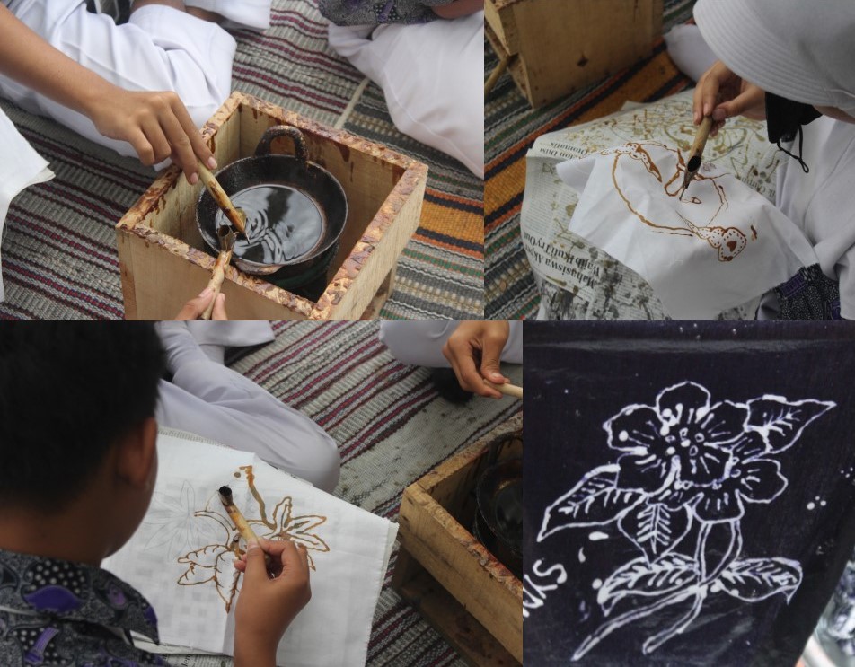 Membatik, menggunakan canting yang terisi oleh malam yang dipanaskan dengan kompor minyak. Estimasi waktu yang dibutuhkan yaitu 30 – 60 menit hingga proses pewarnaan. Dengan media kain berukuran sapu tangan. Cocok untuk media pembelajaran bagi pemula.